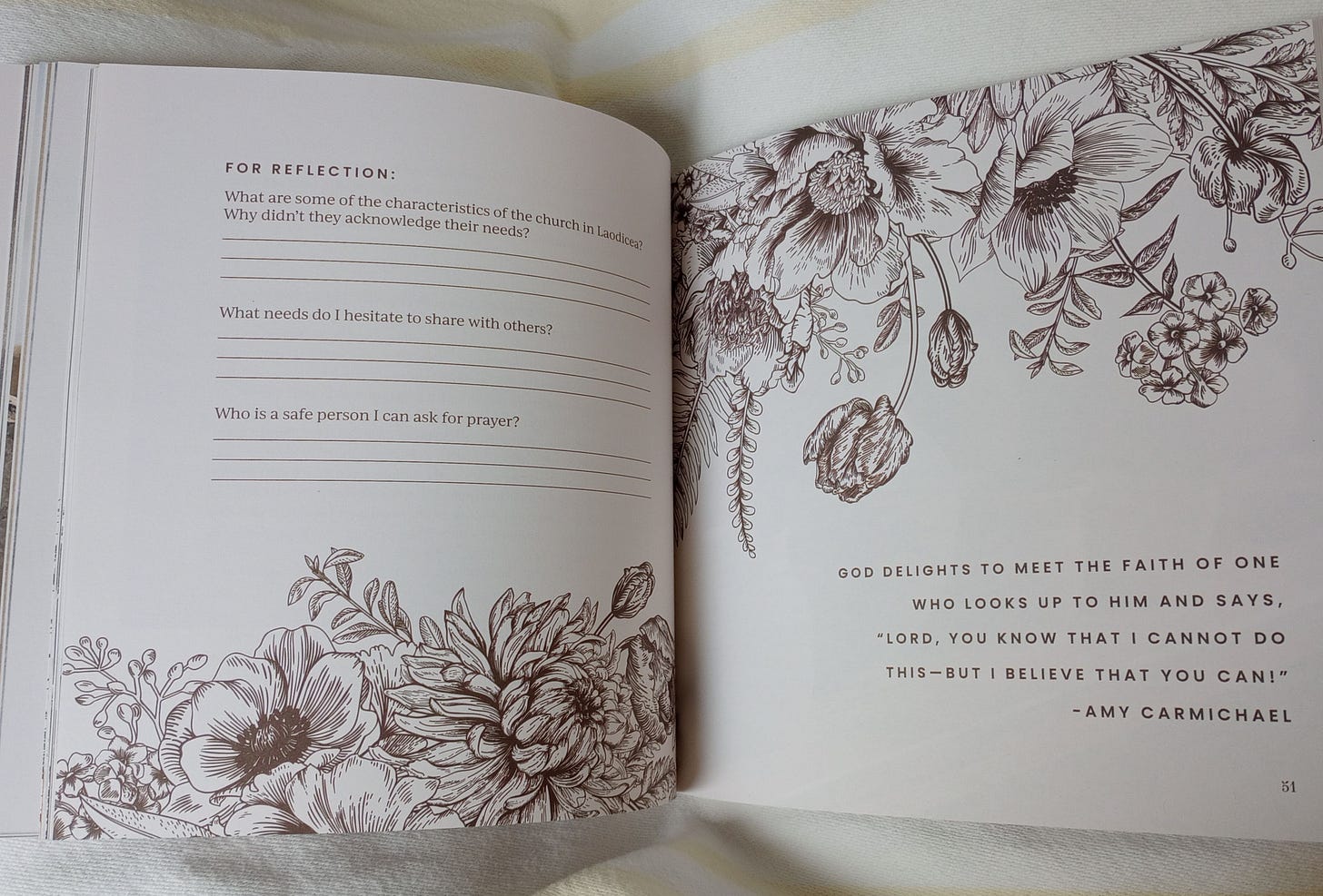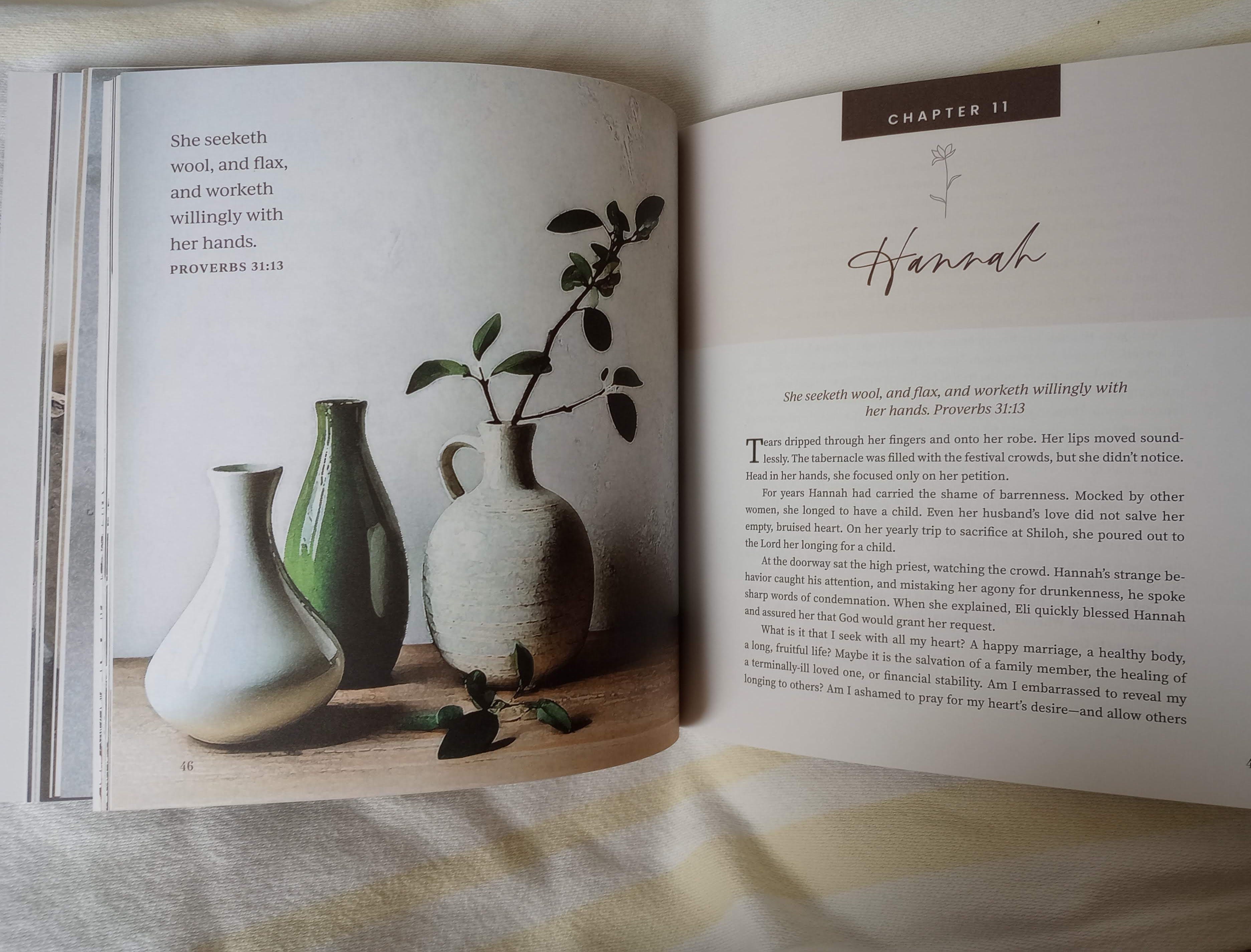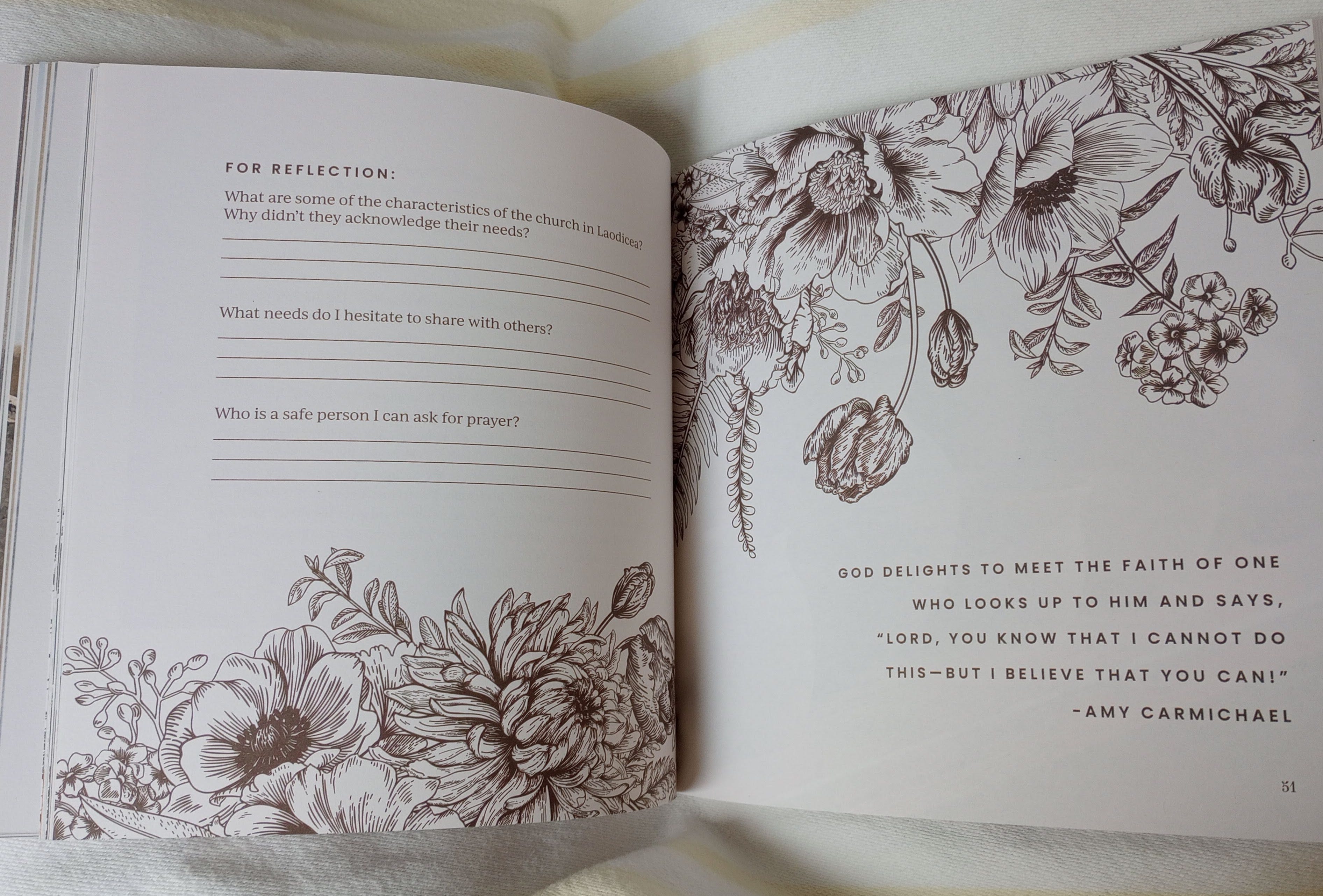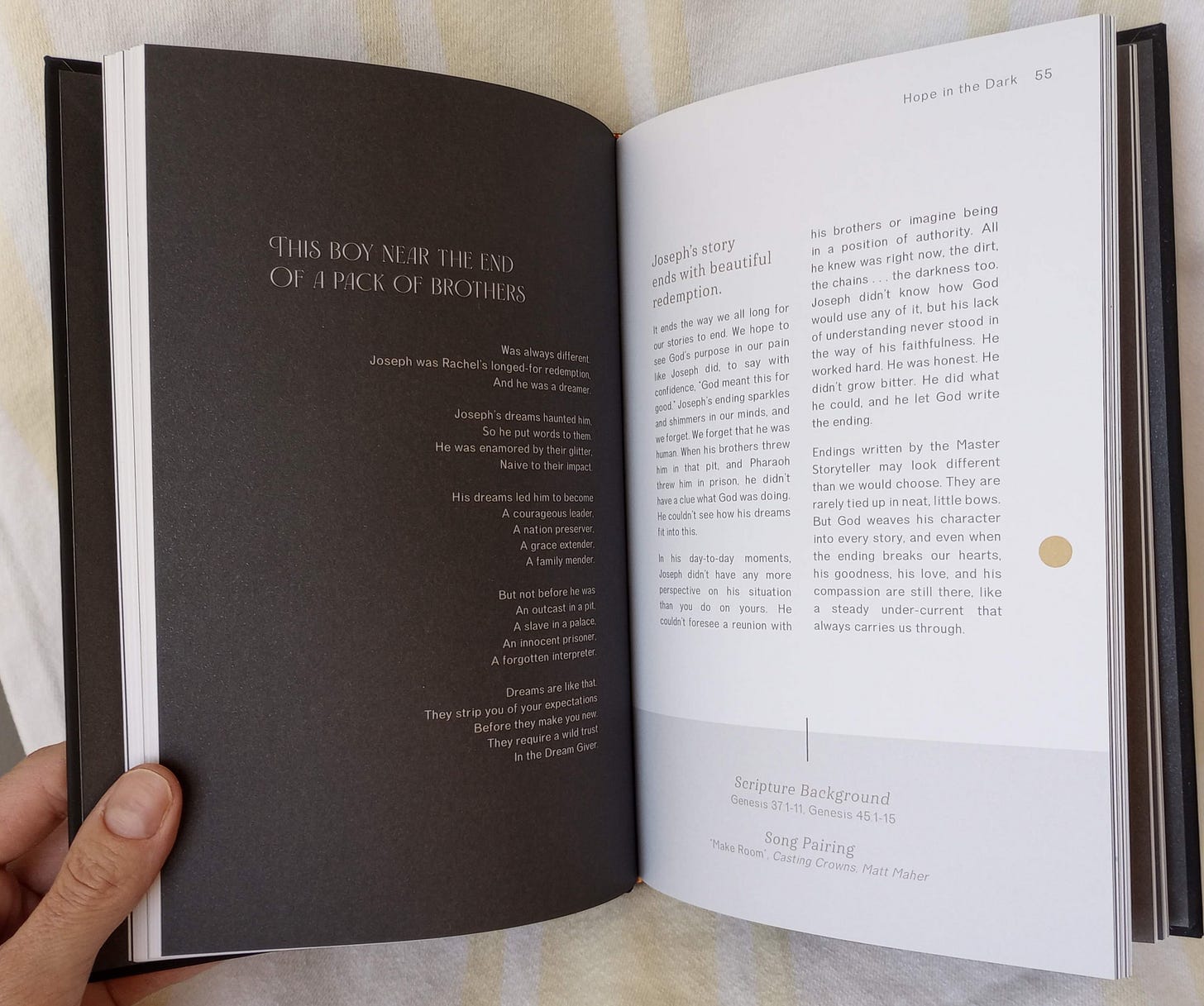 Beautifully designed, this book has artwork mixed in among the free verse poetry, devotionals on Bible characters, and thoughtful journaling prompts.